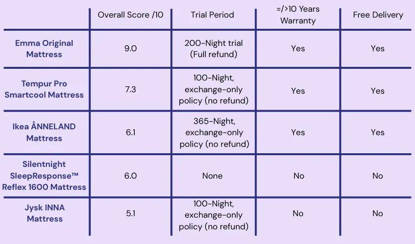 Based on our comparison,the Emma Original Mattress is the clear winner. It delivers superior comfort, adaptability and consumer-friendly terms,outclassing rivals. While IKEA and JYSK offer dependable, budget-friendly alternatives, and Silentnight and Tempur appeal to niche preferences, Emma remains the most well-rounded and trustworthy option. For Irish sleepers seeking comfort backed by service, Emma Sleep stands out as the top choice.